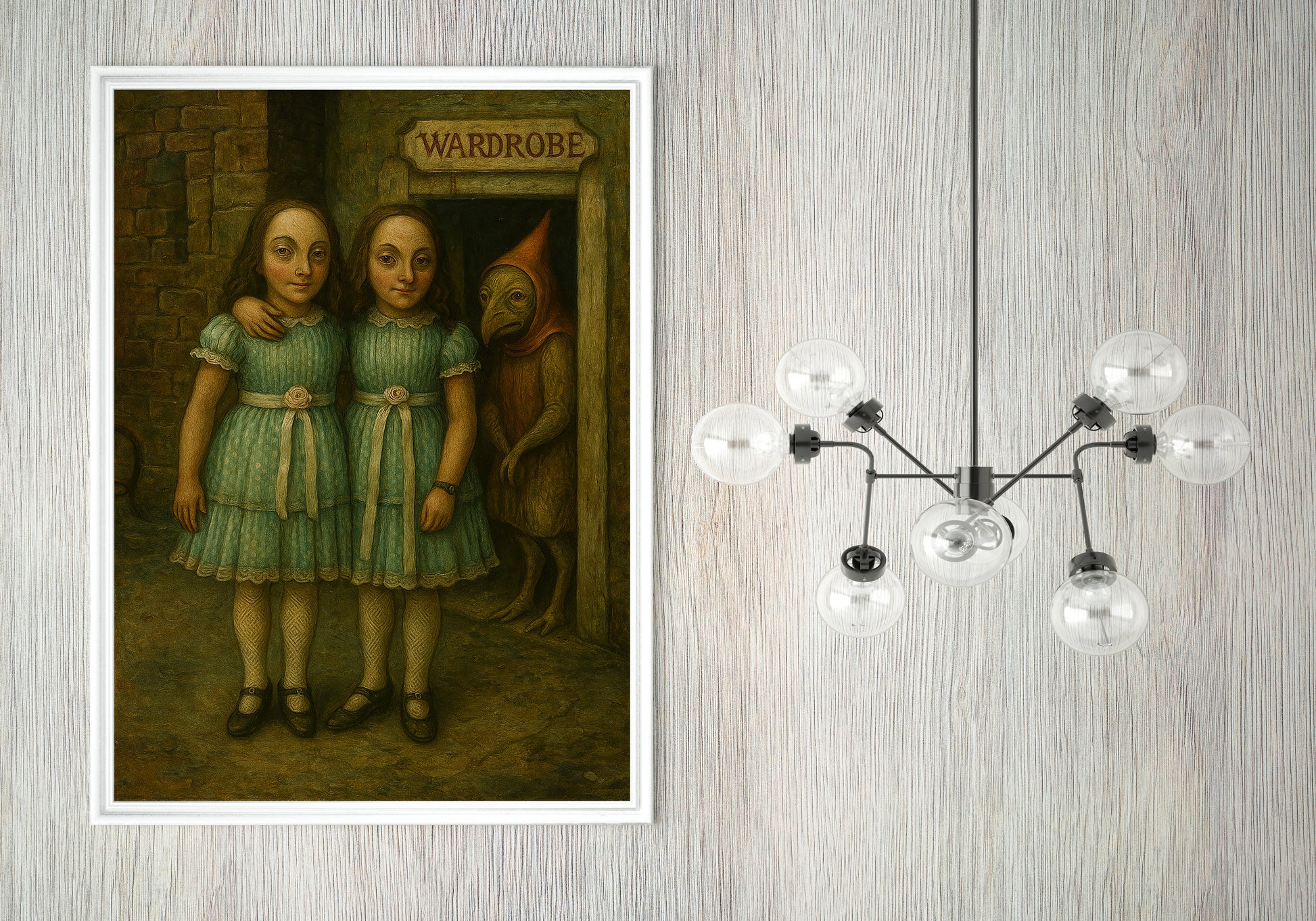 Step into a world of eerie charm with this surreal art print inspired by The Shining. Featuring a haunting portrayal of twin girls in matching blue dresses and an unsettling creature emerging from a wardrobe, this piece masterfully blends horror and dark fantasy. Perfect for collectors of macabre art, fans of psychological thrillers, or anyone drawn to the uncanny, it evokes a vintage storybook aesthetic with a chilling twist.
